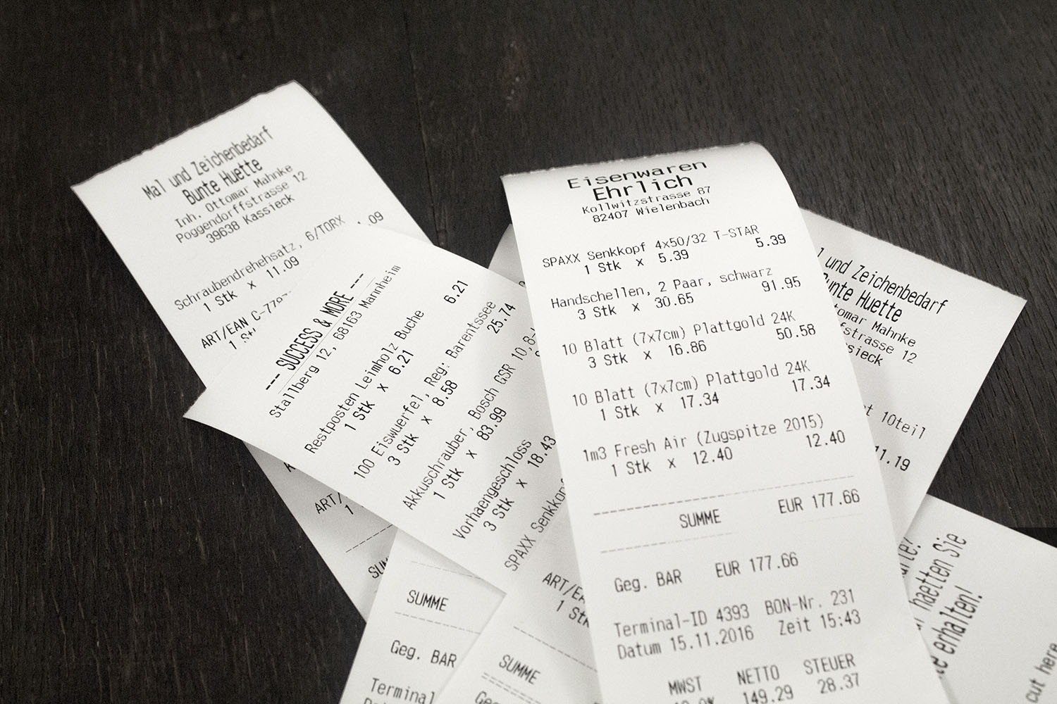 Made from stainless steel, this inconspicuous machine is suited to the harsh environment of the streets. It generates receipts for random art supplies, printed on thermal paper like real shop receipts.
